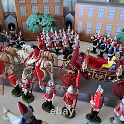 As seen there are a lot of soldiers on horseback wiyth one only hores tail casualty although there is some scuffing to them with age as these are form the 1970s 55 years old! I have had the tin especially made for the soldiers to rest in and is unique to me. AI takes over now -The attention to detail on these figures is astonishing, from the Queen' WAVING to the Duke's uniform. The brand of these toys is Corgi, known for their high-quality diecast and vehicle toys.